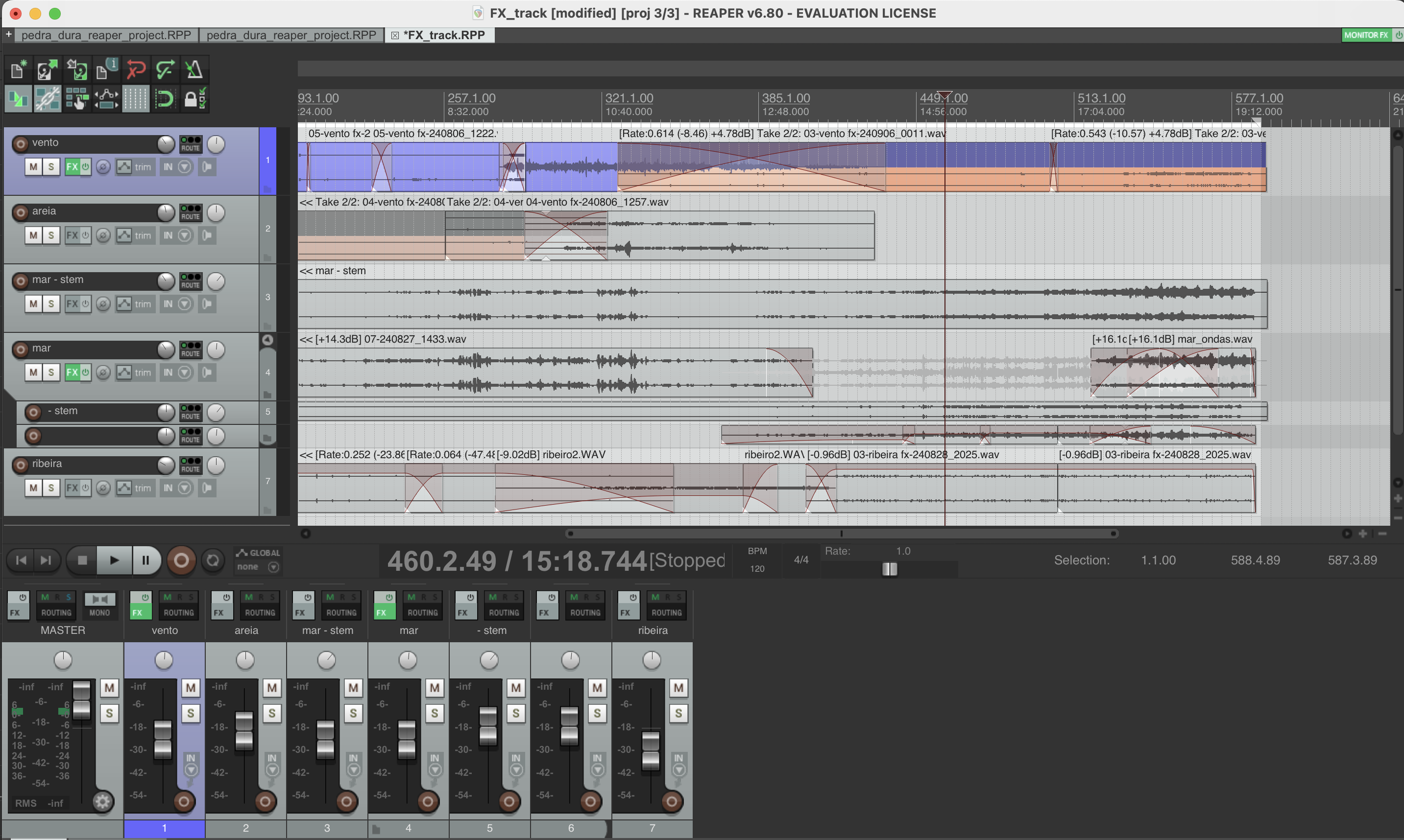 Para o som do mar, utilizei as gravações feitas com o microfone direcional, que transmitiram a profundidade e a textura da água a bater em diferentes rochas, a diferentes distâncias. Equalizei o som recorrendo a alguns filtros da FabFilter^[Plugin de áudio para mistura e master, disponível em https://www.fabfilter.com/] e consegui acentuar a sensação de imensidão e de transformação contínua que o mar representava. Já as gravações da areia resultaram num granulado texturizado que trouxeram à composição um elemento mais rítmico que contrastava com os sons contínuos da água. Para destacar este elemento, criei uma série de camadas sonoras com recurso ao sintetizador granular Emergence^[Sintetizador granular desenvolvido por Daniel Gergely disponível em https://danielgergely.net/emergence] que resultaram também em alguns artefactos sonoros. Para as gravações da ribeira doce, fiz algumas sobreposições para criar um diálogo sonoro que evocasse o esculpir da água. O som do vento na floresta de bambu foi outro aspeto central da composição que através do ranger dos caules, adiciona outra camada de ritmo e timbre à composição.