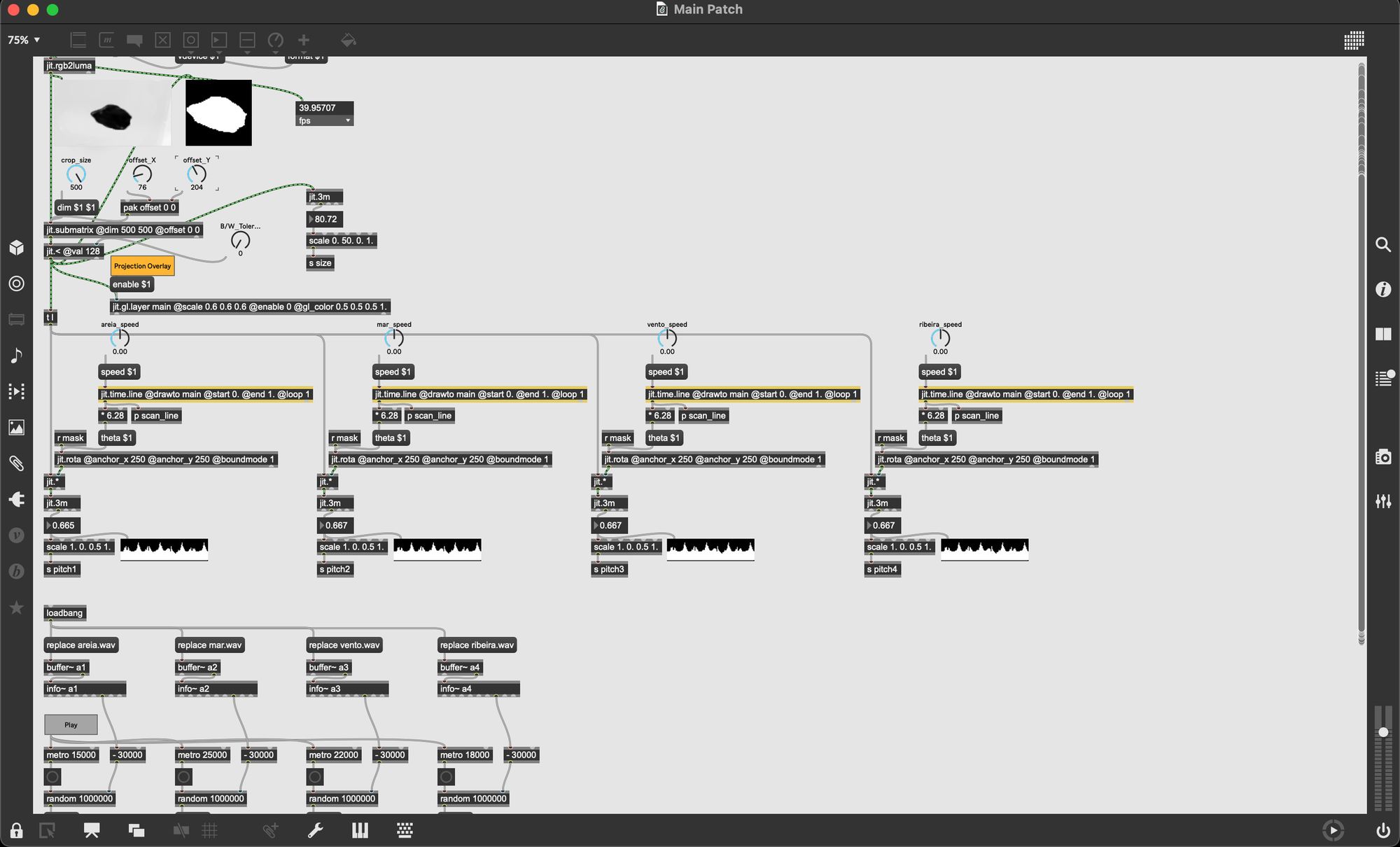 O patch no MaxMSP foi concebido para interpretar a rotação das imagens das pedras e o contraste entre as áreas pretas e brancas da fotografia, resultando em valores numéricos que, por sua vez, modulavam as ondas sinusoidais. Este processo resultou em sons que variavam em frequência, refletindo diretamente a forma do contorno da pedra. As oscilações sonoras criadas por este mapeamento especulavam uma nova forma de escuta, em que a pedra deixava de ser um objeto estático e passava a ser percebida como algo dinâmico, em transformação, mesmo que a um nível puramente percetivo.